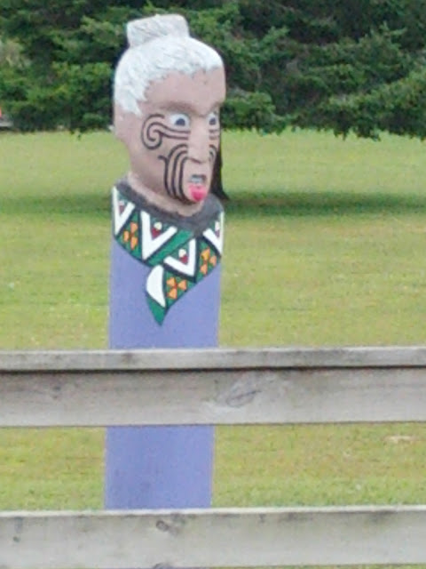 From there I continued on, taking another short break just after Tapapa, at a cafe in a stand of native bush that I have fond memories of from my childhood, though its name escapes me (and Google Maps fails me). At Tapapa, there were some interestingly decorated - and seemingly fairly recent - Maori totems on display at the Marae: